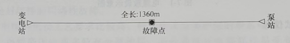 此(ci)線路經第一次跳閘修復后相(xiang)隔10天又發(fa)生(sheng)跳閘,用(yong)(yong)(yong)兆歐表測(ce)(ce)量(liang)B相(xiang)對(dui)(dui)地(di)(di)絕緣電(dian)阻為(wei)0,在泵站端用(yong)(yong)(yong)萬用(yong)(yong)(yong)表測(ce)(ce)量(liang)B相(xiang)對(dui)(dui)地(di)(di)絕緣電(dian)阻為(wei)500Ω,在變電(dian)站測(ce)(ce)量(liang)B相(xiang)對(dui)(dui)地(di)(di)絕緣電(dian)阻為(wei)100Ω,兩(liang)次測(ce)(ce)量(liang)值不一樣,分析可能發(fa)生(sheng)了斷(duan)線故障,經過連續性(xing)測(ce)(ce)試確定為(wei)B相(xiang)斷(duan)線,于是最(zui)后確診(zhen)該(gai)線路發(fa)生(sheng)了單相(xiang)開路并接地(di)(di)故障,應選用(yong)(yong)(yong)低壓脈沖法測(ce)(ce)量(liang)電(dian)纜的(de)故障距離。電(dian)纜敷設情況如圖1-1所示。