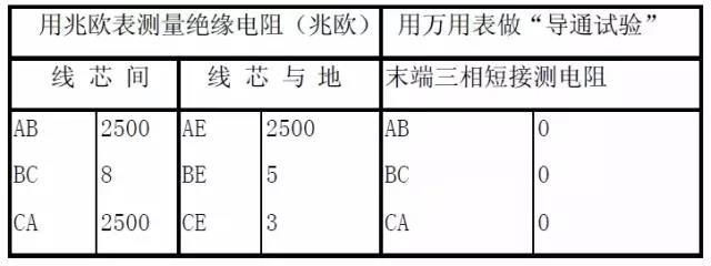 測量絕緣電阻時,使用兆歐表(1千伏以下的電纜,用1000伏的兆歐表;1千伏以上的電纜,用2500伏的兆歐表)來測量電纜線芯之間和線芯對地的絕緣電阻;進行“導通試驗”時,將電纜的末端三相短接,用萬用表在電纜的首端測量芯線之間的電阻。現將一故障電纜的測量結果列于表2中,供參考。