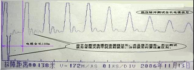 測試過程:由于電纜一頭在電氣控制房下面的地下室內,不好下去進行測試,另外一頭在電線桿上,沒有取下電纜接頭,就斷開兩頭開關,用四根電線從電線桿上分別引下電纜芯線,及鎧裝連線進行測試。先用低壓脈沖方法,分別測試好相對鎧裝、壞相對鎧裝的電纜全長波形,測試結果與測試波形基本相同,測試的電纜全長為138m,測試波形如圖1所示 :