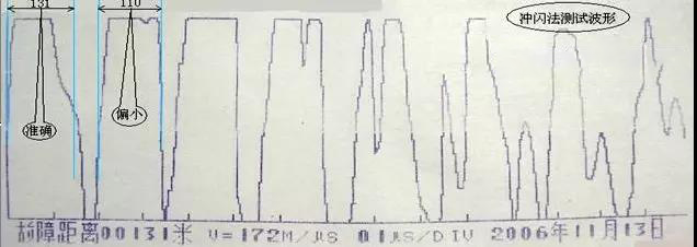 在測試波形中,我們可以看到,有許多小的反射波形,是由于連接引線過長引起的干擾反射,所以現場測試時,連接線要盡量短。另外,連接線的長度包含在測試數據內,分析測試波形時要注意。