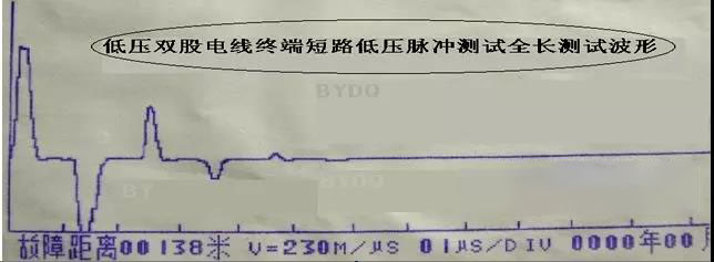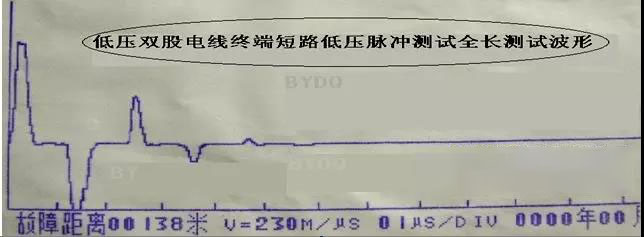 (2)、西安某電力公司,用低壓雙股電線做模擬測試,電線終端短路,測試全長波形如圖2所示,為標準的脈沖法測試短路故障波形。